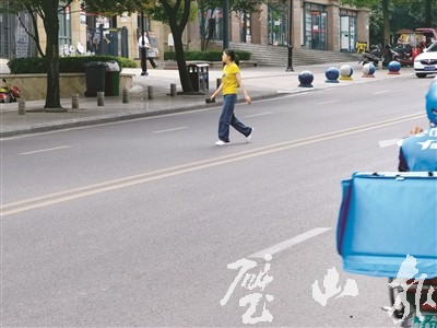 恒大綠島新城小區(qū)附近,行人橫穿馬路。(區(qū)文明辦供圖)