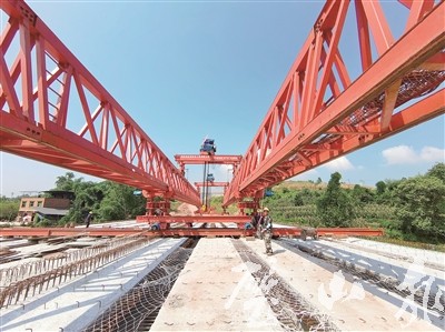 施工現(xiàn)場,工人們正在架設(shè)預(yù)制T梁。