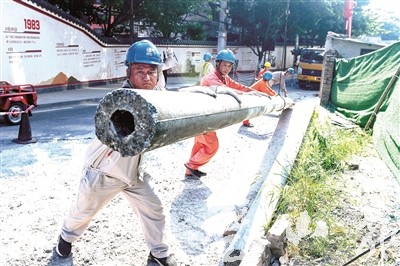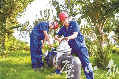 8月4日,聚金大道,渝山公司維護人員頂著炎炎烈日維護供水管道。