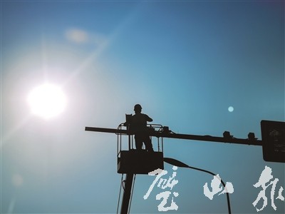 8月5日,璧山街頭,工人頂著烈日檢修監控。