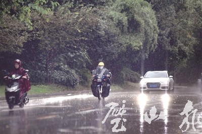 8月13日,沿河東路,市民騎行在暴雨中。從8月12日夜間起,我區出現不同程度的降雨,暑熱緩解,涼爽“接棒”,市民直呼“涼快”。(記者 曾清龍 攝)