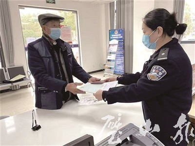 輔警李冬晴將辦理好的遷戶資料交到老人手中
