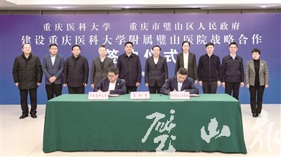 重慶醫科大學黨委書記劉宴兵、區委書記秦文敏出席簽約儀式。區長江志斌和重慶醫科大學校長黃愛龍代表雙方簽署戰略合作協議。