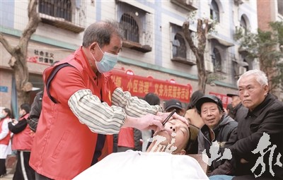 來鳳街道志愿者為群眾修面(記者 朱大亮 攝)