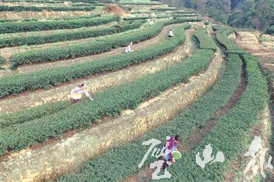 ▲ 3月4日,三合鎮茶葉基地內,茶農在采摘春茶。