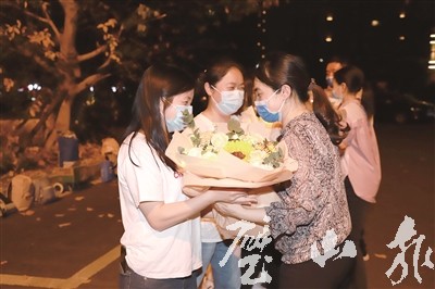抵達區人民醫院后,醫務人員有序排隊接受了核酸檢測?,F場,迎接隊伍送上鮮花迎接醫務人員的凱旋歸來。