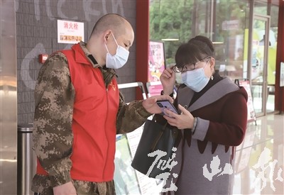 圖⑥:3月20日,在俊豪中央大街,工作人員正在檢查進出人員渝康碼、行程碼、場所碼。