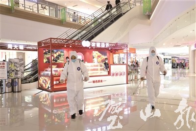 圖⑤:3月20日,在俊豪中央大街,工作人員對公共場所進行全面消殺。