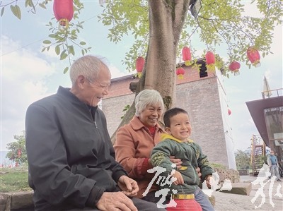 該作品由七塘鎮志愿服務總隊報送,畫面是爺爺奶奶和孫子笑容滿面地坐在掛著紅燈籠的樹下。創作者彭金表示,農村的留守兒童大多是由爺爺奶奶帶著,雖然父母不能經常陪伴,但在爺爺奶奶的愛護下,孩子的幸福感沒有缺席。