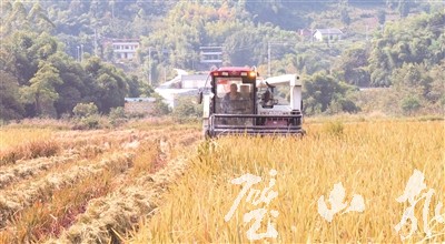 在該鎮(zhèn)浸口村大米種植基地,萬里晴空和金黃稻穗相互映襯,400多畝顆粒飽滿的稻穗壓彎了稻桿。伴隨著陣陣轟鳴,收割機在稻田里來回穿梭,收割、脫粒、粉碎稻桿等工序一氣呵成,田野上呈現(xiàn)一幅忙碌的豐收畫卷。