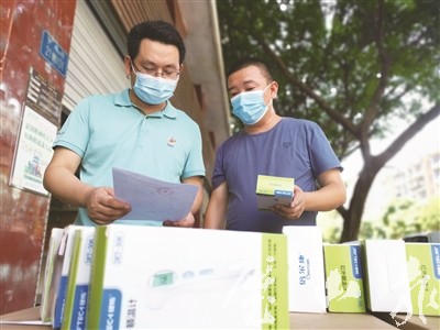 8月11日,記者在區應急局物資倉庫處看到,來鳳街道、三合鎮等鎮街防疫工作人員正排隊領取口罩、體溫槍、防護服、消毒液、身份證識別儀等醫療物資,核對物資數量、簽字、領取,現場秩序井然。