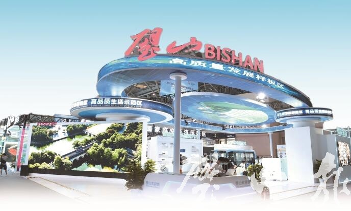 璧山展館位于重慶國博中心N2館,展館面積350平方米。展館為凸顯璧山“高質量發展樣板區”“高品質生活示范區”的城市定位,以“科技藍”為主色系,采取全開放式設計,頂部采用“智慧之眼”元素作為主要造型,輔以智能設備點綴,科技感十足。