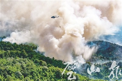 8月25日,八塘鎮,直升機在山火上空灑水滅火。