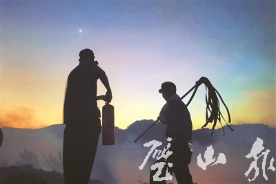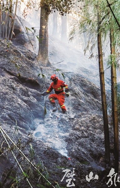 8月25日,八塘鎮陽龍后山,來自云南的森林消防隊員在清理余火。