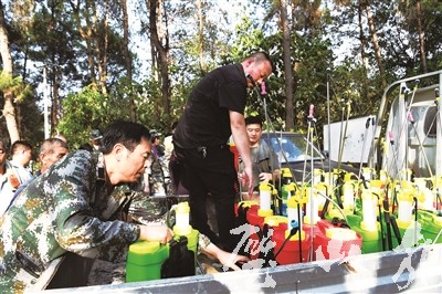 8月24日,七塘鎮陽岫村,志愿者分發噴霧器。