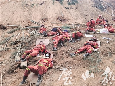 8月25日,八塘鎮陽龍后山,云南森林消防隊員鏖戰一夜后在防火隔離帶休息。