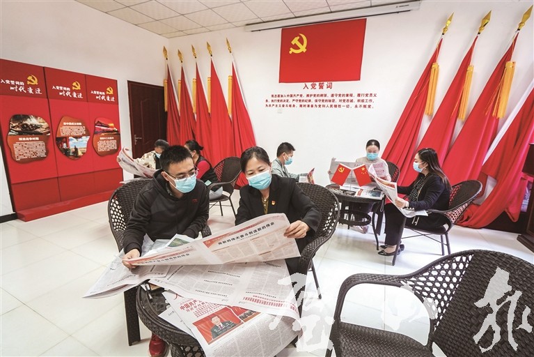 10月17日,璧城街道城中社區組織社區干部讀報,學習黨的二十大報告精神。(首席記者 謝捷 攝)