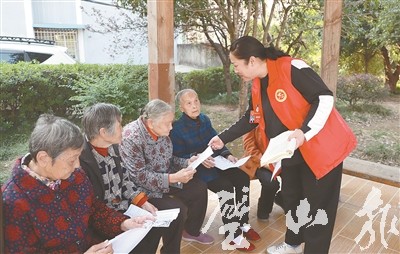 在河邊鎮,志愿者為居民發放“住得文明”宣傳資料。