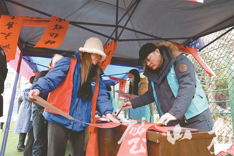 廣場上,寫春聯的桌前人潮涌動,書法愛好者們將一幅幅寓意平安和諧、吉祥如意的春聯、福字寫好后,群眾爭相挑選。而在全家福拍照區域,也有不少群眾停留,隨著快門按下,一張張幸福的笑臉被定格下來。與此同時,相關單位還派出志愿者、工作人員等,為群眾提供志愿幫扶、科技培訓、科普宣傳、健康咨詢、政策宣傳、法律咨詢、理論宣傳、社科普及、文藝演出等集中服務活動,并向困難婦女、兒童、困境青少年送上慰問物品,讓他們在寒冷的冬日感受到濃濃的關愛和溫暖。