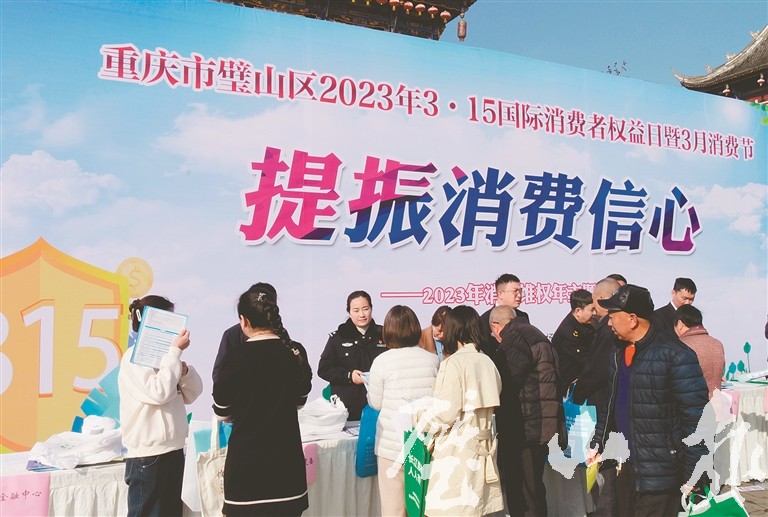璧山報訊(記者 任攀 文/圖)3月13日,區市場監管局聯合區法院、區檢察院、區教委、區經濟信息委、區公安局、區司法局、區住房城鄉建委等多個部門在南門唐城正南門開展“提振消費信心”主題活動。