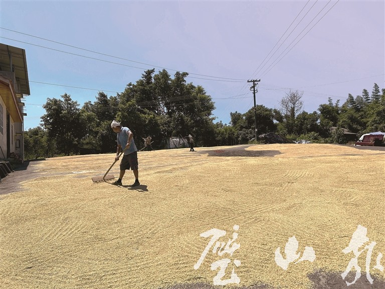 璧山報訊(記者 朱大亮 文/圖)近日,記者在健龍鎮寨子村看到,一粒粒金燦燦的稻谷鋪滿院壩,村民們正忙著翻曬新稻谷。
