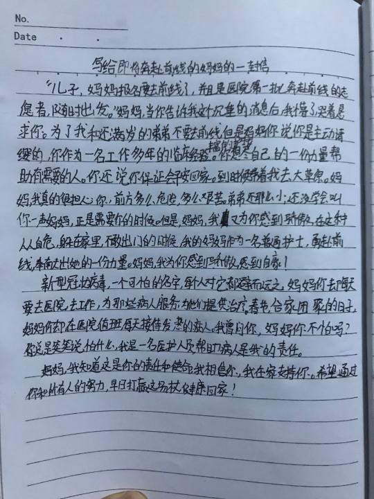 “兒子,媽媽報名要去前線了,并且是醫院第一批奔赴前線的志愿者,隨時出發。”媽媽,當你告訴我這個沉重的消息后,我懵了,哭著懇求你,為了我和還滿歲的弟弟不要去前線。但是媽媽你說你是主動請纓的,你作為一名工作多年的臨床經驗豐富的護士,你想盡自己的一份力量幫助有需要的人。你還說你保證會平安回家,到時候帶我去大草原。媽媽,我真的很擔心你,前方那么危險,多么艱苦。弟弟還那么小,還沒學會叫你一聲媽媽,正是需要你的時候。但是,媽媽,我又為你感到驕傲,在這種人人自危躲在家里,不敢出門的時候,我的媽媽作為一名普通護士,勇赴前線,奉獻出她的一份力量。媽媽,我為你感到驕傲,感到自豪!