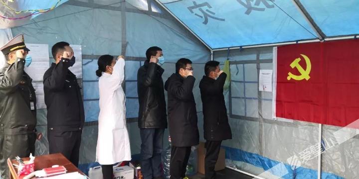 九永高速來鳳下道口臨時檢疫點黨支部全體黨員在黨旗下宣誓,決心戰(zhàn)勝疫情。
