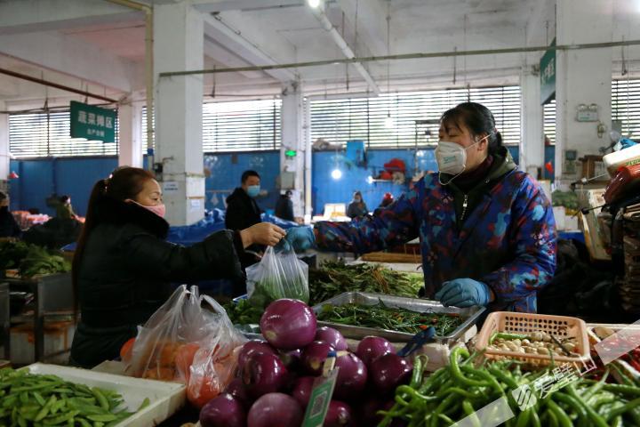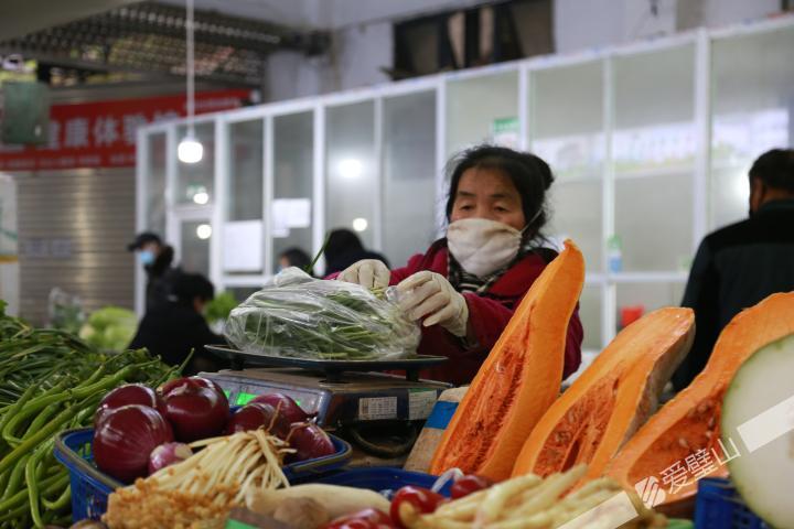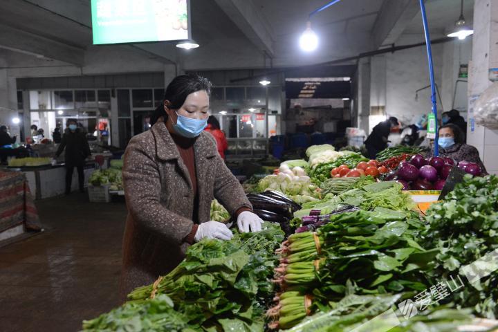 “勤洗手,多通風,戴口罩,不扎堆……”在小河溝菜市場入口處,音箱循環(huán)播放著防疫宣傳語,“請佩戴口罩進入市場”等標識語隨處可見。進入市場記者發(fā)現,銷售蔬菜、肉類、瓜果等食用產品的攤主不僅戴上了口罩,還戴上手套為前來購物的市民進行菜品挑選、稱重,既要保障了商品質量安全,也保護了顧客的安全。