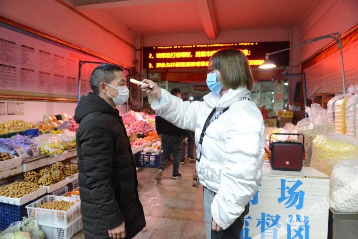 “您好,請佩戴好口罩,主動配合我們檢測體溫,感謝您的配合。”簡單寒暄后,北街農貿市場出入口的工作人員,一邊用紅外線體溫計為消費者測量體溫,一邊耐心地向消費者解釋,凡是體溫超過37.3攝氏度或身體異樣的居民,將禁止入內,并聯(lián)系相關醫(yī)院采取相應措施。同時,溫馨提示市民盡量減少在場內停留的時間。