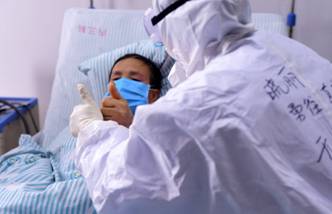 2020年2月6日,璧山區(qū)人民醫(yī)院感染疾病科隔離病房里胡曉麗與患者點贊互相鼓勵。胡悅建攝