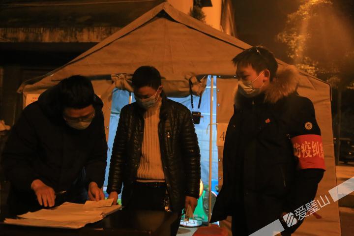 深夜10點,在璧城街道城中社區卡點,來自區委編辦的余亮正和另外兩名工作人員值守在卡點上。一整天的進出登記、體溫檢測、人員排查,卡點從繁忙中慢慢沉寂下來。外面寒風一陣陣刮進帳篷,三人將登記的桌子搬進了帳篷。