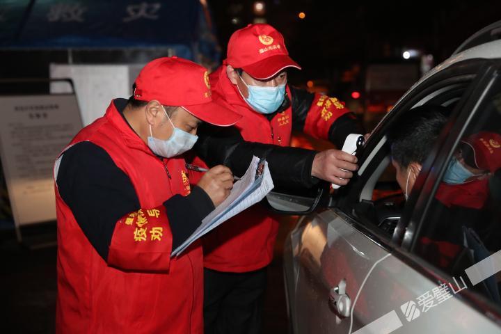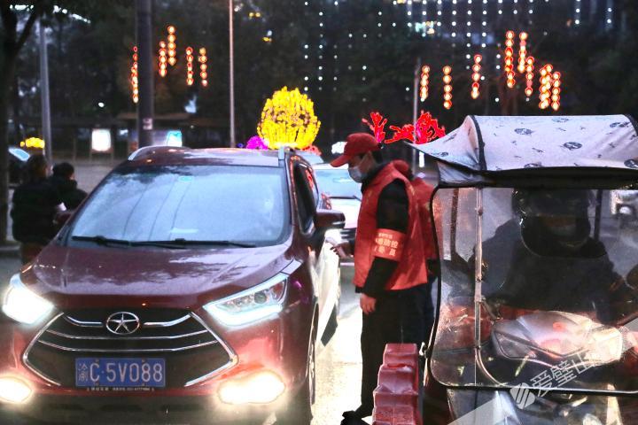 元宵夜當晚,天空中下著細雨,在新塔還建房片區值守點,等待通過卡點的車輛已經排起了長龍。來自區林業局的楊林和朱三中一人拿登記冊,一人拿著額溫槍,在卡點上忙得。