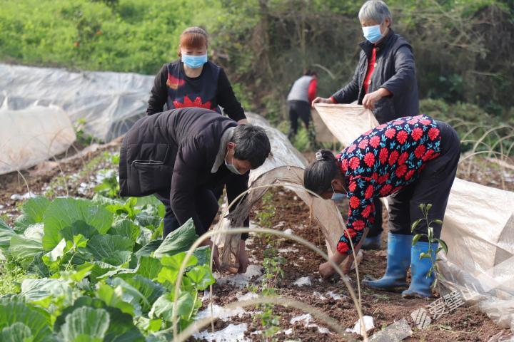 12日,在福祿鎮紅山村,菜農王光中的蔬菜田里一片忙碌的景象。春節以來,王光中每天要向批發市場供應400斤左右的茼蒿、冬莧菜等時令蔬菜,近日天氣晴好,王光中緊抓有利時機,移栽新一季的四季豆苗,做到春收春播兩不誤。(記者 黃瑞 攝)