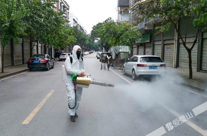 連日來,來鳳街道東街社區專門從事消毒設備售賣的經銷商謝德,每天早上8點,背著近20斤重的消毒水,為社區開展義務消毒。(記者 曾清龍 攝)