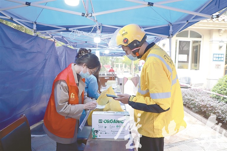 在瀛嘉天下·水岸國際、黛山壹品、金劍濱河印象小區等封控區域,居民在線上訂購或找親朋好友購買的生活物資配送到小區門口后,經緩沖區志愿者仔細消毒消殺、登記、打包,再由小區內的志愿者利用推車或步行的方式送至各單元樓下。對于有確診病例的樓棟,小區內志愿者按樓棟號分區整理好后,由樓棟的志愿者逐層送到居民家門口,其他樓棟則實行“人不出區,錯峰取物”,在嚴格落實個人防護的前提下,每天每戶派一名代表下樓到指定區域領取生活物資。