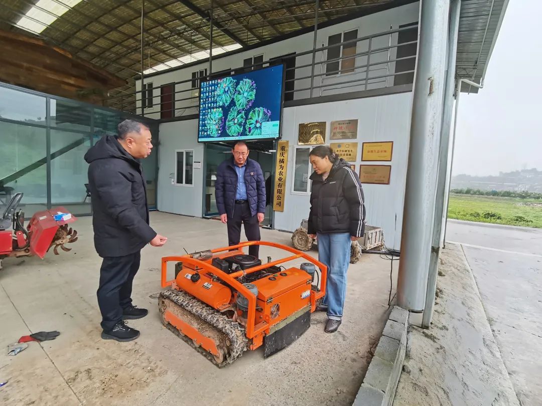 橘為果園公司與西南大學合作研發了遙控割草機、田間運輸車等微型農機,率先示范應用自動開閉大棚、自動果品清洗機、自動彌霧施藥等設施,已建成高標準智慧化果園,入選“中國農業科學院—重慶璧山柑橘科技小院”。在橘為果園,周梁與相關負責人深入交流,仔細聽取品種培育、現代農機研發、田間智慧管理、產銷對接等情況介紹。