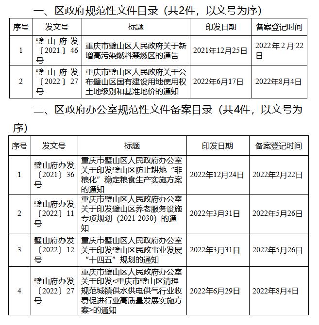 重慶市璧山區人大常委會 2022年度規范性文件備案目錄